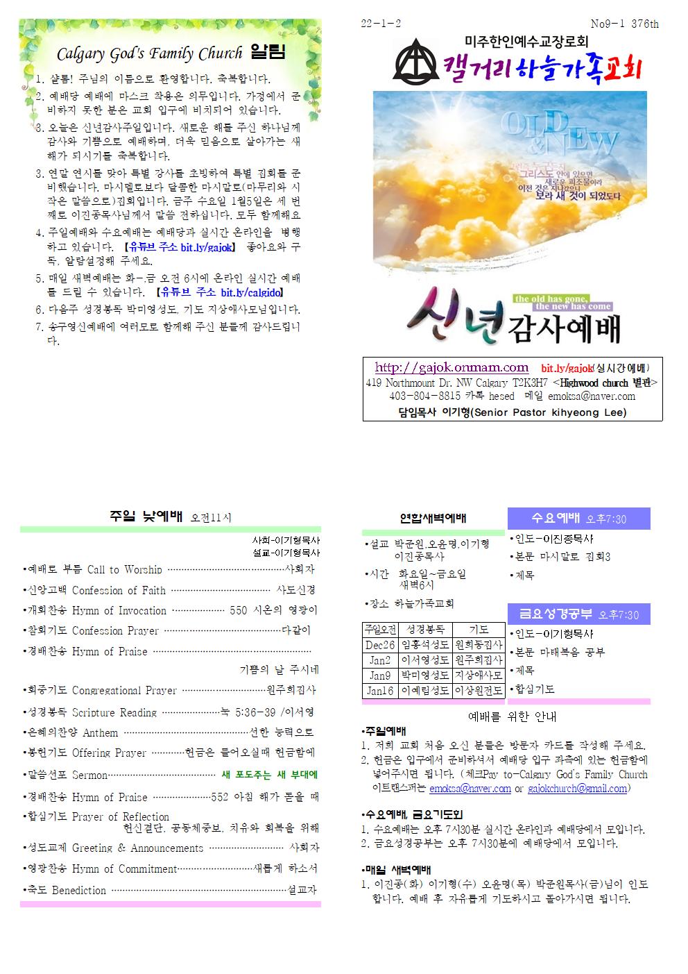 Calgary God's Family Church 알림 1. 샬롬! 주님의 이름으로 환영합니다. 축복합니다. 2. 예배당 예배에 마스크 착용은 의무입니다. 가정에서 준비하지 못한 분은 교회 입구에 비치되어 있습니다. 3. 오늘은 신년감사주일입니다. 새로운 해를 주신 하나님께 감사와 기쁨으로 예배하며, 더욱 믿음으로 살아가는 새해가 되시기를 축복합니다. 3. 연말 연시를 맞아 특별 강사를 초빙하여 특별 집회를 준비했습니다. 마시멜로보다 달콤한 마시말로(마무리와 시작은 말씀으로)집회입니다. 금주 수요일 1월5일은 세 번째로 이진종목사님께서 말씀 전하십니다. 모두 함께해요 4. 주일예배와 수요예배는 예배당과 실시간 온라인을 병행하고 있습니다. 【유튜브 주소 bit.ly/gajok】 좋아요와 구독, 알람설정해 주세요. 5. 매일 새벽예배는 화-,금 오전 6시에 온라인 실시간 예배를 드릴 수 있습니다. 【유튜브 주소 bit.ly/calgido】 6. 다음주 성경봉독 박미영성도, 기도 지상애사모님입니다. 7. 송구영신예배에 여러모로 함께해 주신 분들께 감사드립니다.