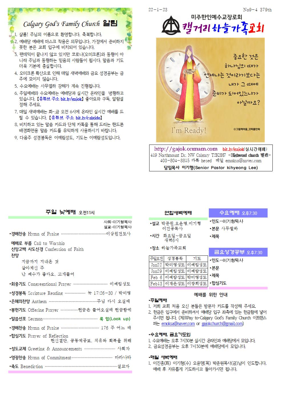 1. 샬롬! 주님의 이름으로 환영합니다. 축복합니다. 2. 예배당 예배에 마스크 착용은 의무입니다. 가정에서 준비하지 못한 분은 교회 입구에 비치되어 있습니다. 3. 팬데믹이 끝나지 않고 있지만 코로나(오미크론)와 동행이 아니라 주님과 동행하는 믿음의 사람들이 됩시다. 말씀과 기도 더욱 기본에 충실합시다. 4. 오미크론 확산으로 인해 매일 새벽에배와 금요 성경공부는 금주에 모이지 않습니다. 5. 수요예배는 사무엘하 강해가 계속 진행됩니다. 6. 주일예배와 수요예배는 예배당과 실시간 온라인을 병행하고 있습니다. 【유튜브 주소 bit.ly/gajok】 좋아요와 구독, 알람설정해 주세요. 7. 매일 새벽예배는 화-,금 오전 6시에 온라인 실시간 예배를 드릴 수 있습니다. 【유튜브 주소 bit.ly/calgido】 8. 비치하고 있는 말씀 카드와 단체 카톡을 통해 드리는 핸드폰 배경화면용 말씀 카드를 유익하게 사용하시기 바랍니다. 9. 다음주 성경봉독은 이예림성도, 기도는 이예람성도입니다.