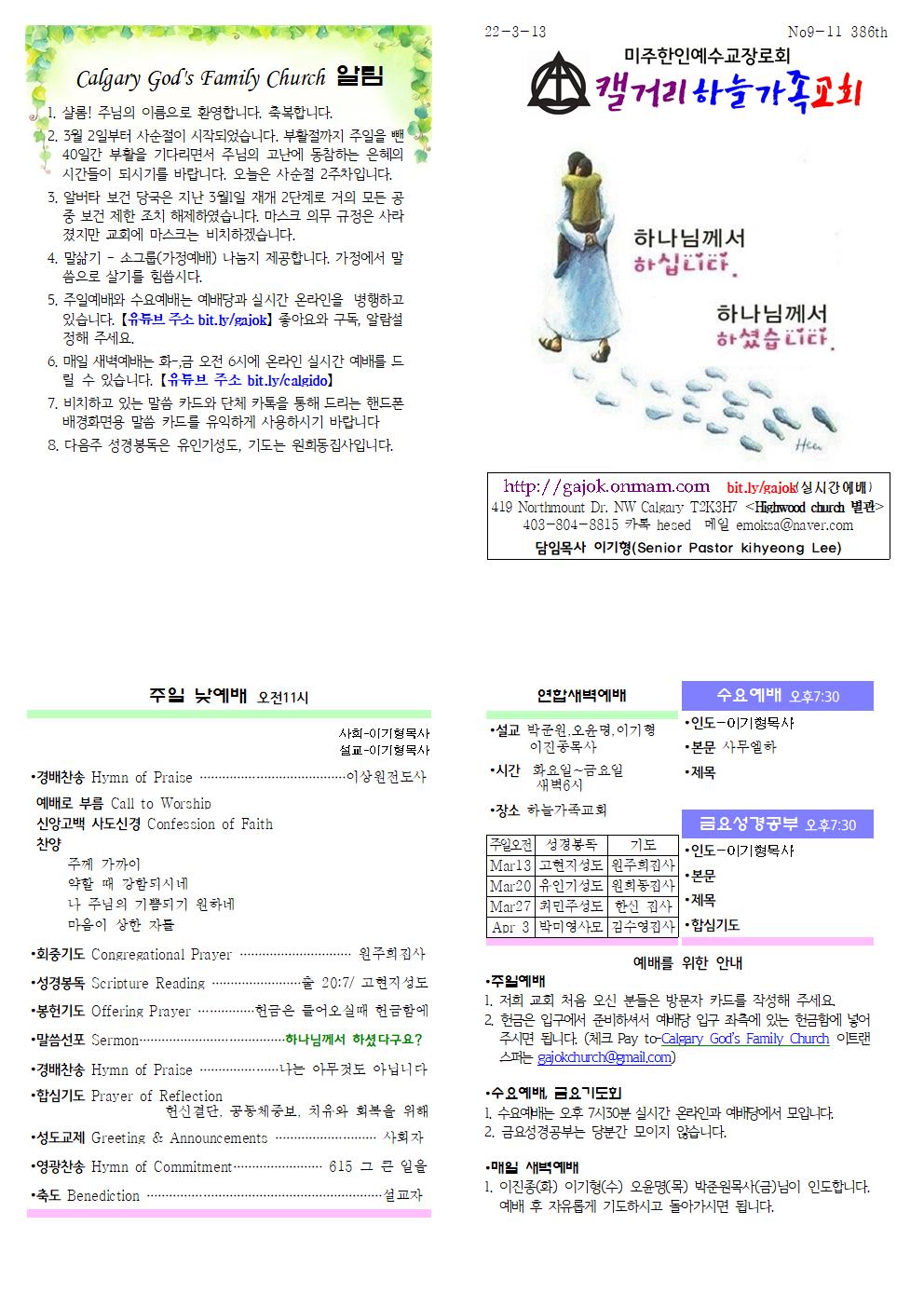 Calgary God's Family Church 알림 1. 샬롬! 주님의 이름으로 환영합니다. 축복합니다. 2. 3월 2일부터 사순절이 시작되었습니다. 부활절까지 주일을 뺀 40일간 부활을 기다리면서 주님의 고난에 동참하는 은혜의 시간들이 되시기를 바랍니다. 오늘은 사순절 2주차입니다. 3. 알버타 보건 당국은 지난 3월1일 재개 2단계로 거의 모든 공중 보건 제한 조치 해제하였습니다. 마스크 의무 규정은 사라졌지만 교회에 마스크는 비치하겠습니다. 4. 말삶기 - 소그룹(가정예배) 나눔지 제공합니다. 가정에서 말씀으로 살기를 힘씁시다. 5. 주일예배와 수요예배는 예배당과 실시간 온라인을 병행하고 있습니다. 【유튜브 주소 bit.ly/gajok】 좋아요와 구독, 알람설정해 주세요. 6. 매일 새벽예배는 화-,금 오전 6시에 온라인 실시간 예배를 드릴 수 있습니다. 【유튜브 주소 bit.ly/calgido】 7. 비치하고 있는 말씀 카드와 단체 카톡을 통해 드리는 핸드폰 배경화면용 말씀 카드를 유익하게 사용하시기 바랍니다. 8. 다음주 성경봉독은 유인기성도, 기도는 원희동집사입니다.