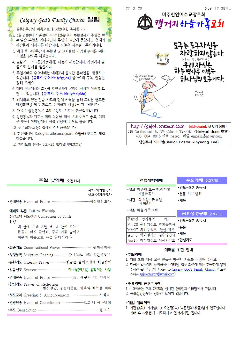 Calgary God's Family Church 알림 1. 샬롬! 주님의 이름으로 환영합니다. 축복합니다. 2. 3월 2일부터 사순절이 시작되었습니다. 부활절까지 주일을 뺀 40일간 부활을 기다리면서 주님의 고난에 동참하는 은혜의 시간들이 되시기를 바랍니다. 오늘은 사순절 3주차입니다. 3. 예배 후 고난주간과 부활절 및 교회설립 기념일 준비를 위한 모임을 갖도록 하겠습니다. 4. 말삶기 - 소그룹(가정예배) 나눔지 제공합니다. 가정에서 말씀으로 살기를 힘씁시다. 5. 주일예배와 수요예배는 예배당과 실시간 온라인을 병행하고 있습니다. 【유튜브 주소 bit.ly/gajok】 좋아요와 구독, 알람설정해 주세요. 6. 매일 새벽예배는 화-,금 오전 6시에 온라인 실시간 예배를 드릴 수 있습니다. 【유튜브 주소 bit.ly/calgido】 7. 비치하고 있는 말씀 카드와 단체 카톡을 통해 드리는 핸드폰 배경화면용 말씀 카드를 유익하게 사용하시기 바랍니다 8. 다음주 성경봉독은 최민주성도, 기도는 한신집사입니다. 9. 성경봉독과 기도는 미리 녹음을 해서 보내 주셔도 좋고, 미리 준비해서 예배당에서 직접 감당해 주셔도 좋습니다. 10. 원주희(원희동) 집사님 이사하셨습니다. 11. 한신집사님 Sobey(strathconasquare 쇼핑몰) 밴또를 개업하셨습니다. 12. 가미노회 참석- 3.21-23 빌라델비아교회당