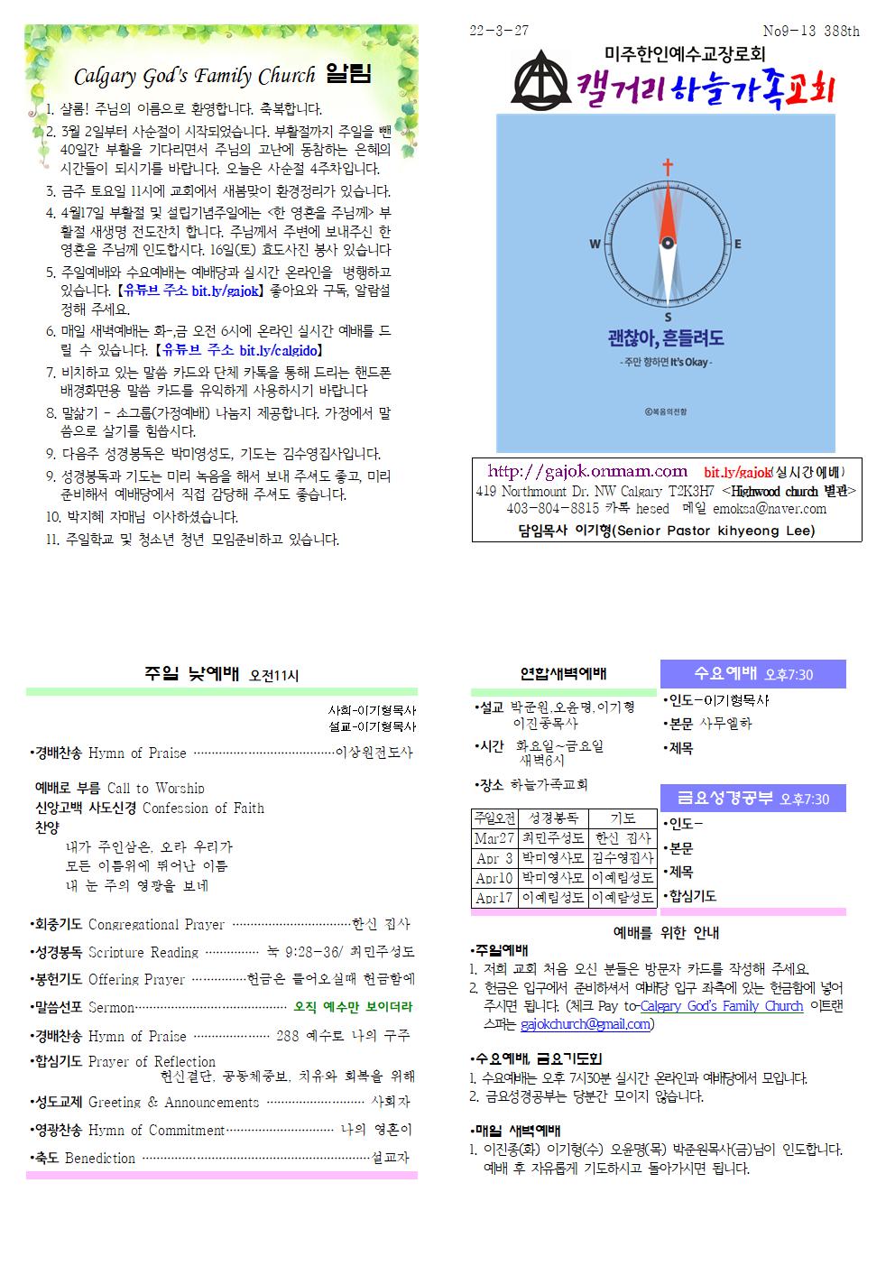 Calgary God's Family Church 알림 1. 샬롬! 주님의 이름으로 환영합니다. 축복합니다. 2. 3월 2일부터 사순절이 시작되었습니다. 부활절까지 주일을 뺀 40일간 부활을 기다리면서 주님의 고난에 동참하는 은혜의 시간들이 되시기를 바랍니다. 오늘은 사순절 4주차입니다. 3. 금주 토요일 11시에 교회에서 새봄맞이 환경정리가 있습니다. 4. 4월17일 부활절 및 설립기념주일에는 <한 영혼을 주님께> 부활절 새생명 전도잔치 합니다. 주님께서 주변에 보내주신 한 영혼을 주님께 인도합시다. 16일(토) 효도사진 봉사 있습니다 5. 주일예배와 수요예배는 예배당과 실시간 온라인을 병행하고 있습니다. 【유튜브 주소 bit.ly/gajok】 좋아요와 구독, 알람설정해 주세요. 6. 매일 새벽예배는 화-,금 오전 6시에 온라인 실시간 예배를 드릴 수 있습니다. 【유튜브 주소 bit.ly/calgido】 7. 비치하고 있는 말씀 카드와 단체 카톡을 통해 드리는 핸드폰 배경화면용 말씀 카드를 유익하게 사용하시기 바랍니다 8. 말삶기 - 소그룹(가정예배) 나눔지 제공합니다. 가정에서 말씀으로 살기를 힘씁시다. 9. 다음주 성경봉독은 박미영성도, 기도는 김수영집사입니다. 9. 성경봉독과 기도는 미리 녹음을 해서 보내 주셔도 좋고, 미리 준비해서 예배당에서 직접 감당해 주셔도 좋습니다. 10. 박지혜 자매님 이사하셨습니다. 11. 주일학교 및 청소년 청년 모임준비하고 있습니다.