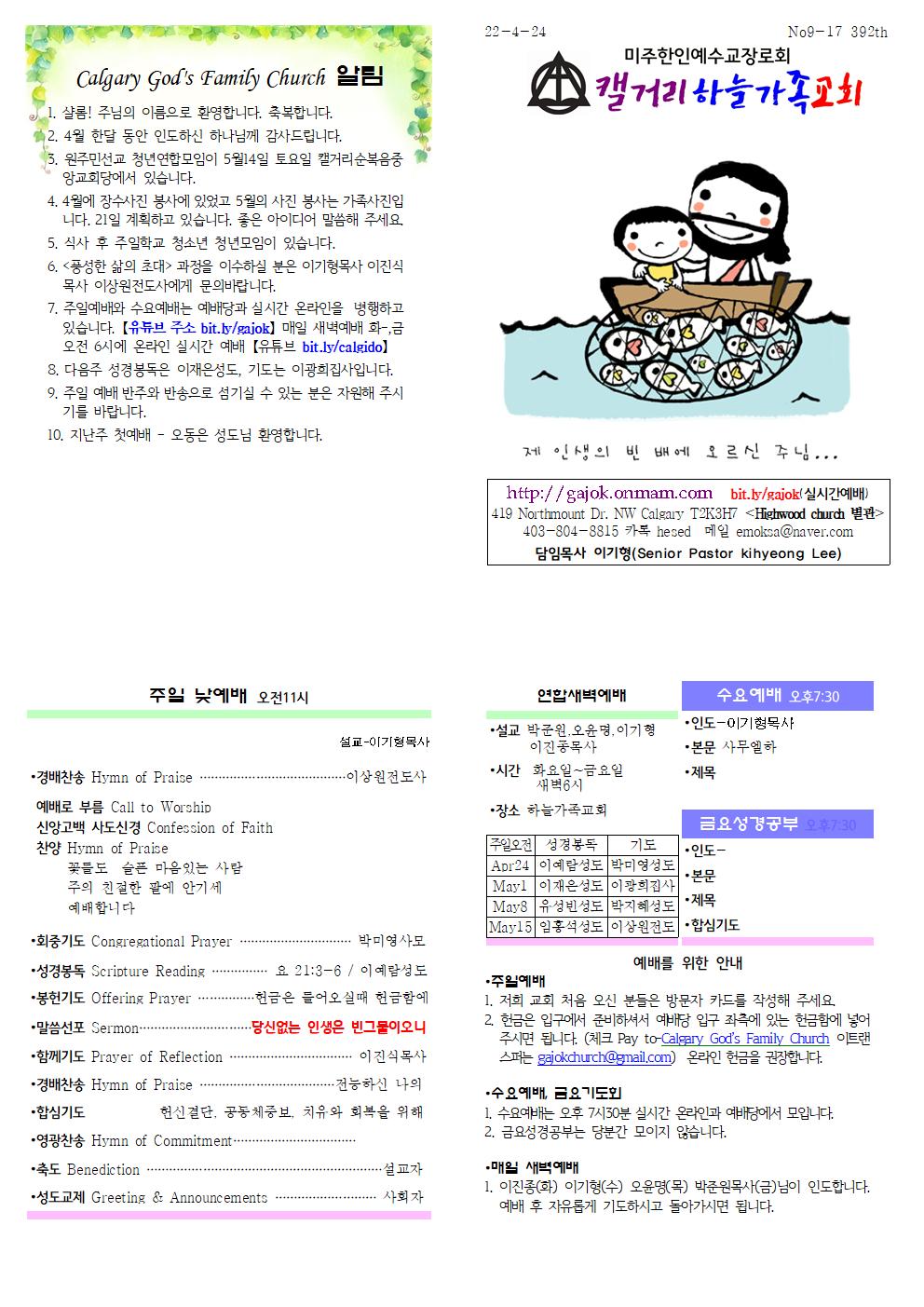 Calgary God's Family Church 알림 1. 샬롬! 주님의 이름으로 환영합니다. 축복합니다. 2. 4월 한달 동안 인도하신 하나님께 감사드립니다. 3. 원주민선교 청년연합모임이 5월14일 토요일 캘거리순복음중앙교회당에서 있습니다. 4. 4월에 장수사진 봉사에 있었고 5월의 사진 봉사는 가족사진입니다. 21일 계획하고 있습니다. 좋은 아이디어 말씀해 주세요. 5. 식사 후 주일학교 청소년 청년모임이 있습니다. 6. <풍성한 삶의 초대> 과정을 이수하실 분은 이기형목사 이진식목사 이상원전도사에게 문의바랍니다. 7. 주일예배와 수요예배는 예배당과 실시간 온라인을 병행하고 있습니다. 【유튜브 주소 bit.ly/gajok】 매일 새벽예배 화-,금 오전 6시에 온라인 실시간 예배 【유튜브 bit.ly/calgido】 8. 다음주 성경봉독은 이재은성도, 기도는 이광희집사입니다. 9. 주일 예배 반주와 반송으로 섬기실 수 있는 분은 자원해 주시기를 바랍니다. 10. 지난주 첫예배 - 오동은 성도님 환영합니다.