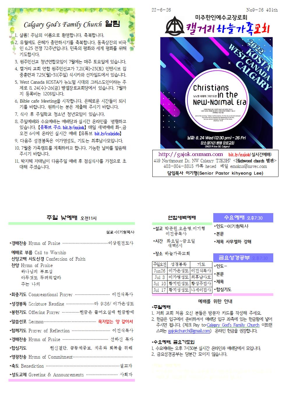 Calgary God's Family Church 알림 1. 샬롬! 주님의 이름으로 환영합니다. 축복합니다. 2. 유월에도 은혜가 충만하시기를 축복합니다. 동족상잔의 비극인 6.25 전쟁 72주년입니다. 민족의 평화와 세계 평화를 위해 기도합시다. 3. 원주민선교 청년연합모임이 7월에는 매주 토요일에 있습니다. 4. 캘거리 교회 연합 원주민선교가 7.21(목)-23(토) 인텐시브 집중훈련과 7.25(월)-31(주일) 식시카와 선차일드에서 있습니다. 5. West Canada KOSTA가 뉴노멀 시대의 그리스도인이라는 주제로 8. 24(수)-26(금) 벧엘장로교회당에서 있습니다. 7월까지 등록비는 120$입니다. 6. Bible cafe Meeting을 시작합니다. 은혜로운 시간들이 되시기를 바랍니다. 원하시는 분은 제출해 주시기 바랍니다. 7. 식사 후 주일학교 청소년 청년모임이 있습니다. 8. 주일예배와 수요예배는 예배당과 실시간 온라인을 병행하고 있습니다. 【유튜브 주소 bit.ly/gajok】 매일 새벽예배 화-,금 오전 6시에 온라인 실시간 예배 【유튜브 bit.ly/calgido】 9. 다음주 성경봉독은 이가영성도, 기도는 최후남사모입니다. 10. 7월중 가족캠프를 계획하려고 합니다. 가능한 날짜를 말씀해 주시기 바랍니다. 11. 박지혜 자매님이 다음주일 예배 후 점심식사를 가정으로 초대해 주셨습니다.