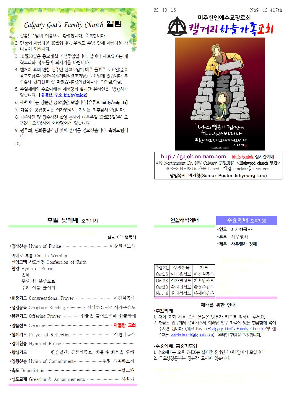 Calgary God's Family Church 알림 1. 샬롬! 주님의 이름으로 환영합니다. 축복합니다. 2. 단풍이 아름다운 10월입니다. 우리도 주님 앞에 아름다운 자녀들이 되십시다. 3. 10월30일은 종교개혁 기념주일입니다. 날마다 새로워지는 개혁교회와 성도들이 되시기를 바랍니다. 4. 캘거리 교회 연합 원주민 선교모임이 매주 둘째주 토요일(순복음교회당)과 넷째주(캘거리성결교회당) 토요일에 있습니다. 추수감사 단기선교 잘 마쳤습니다.(이진식목사, 이예림,예람) 5. 주일예배와 수요예배는 예배당과 실시간 온라인을 병행하고 있습니다. 【유튜브 주소 bit.ly/gajok】 6. 새벽예배는 당분간 금요일만 모입니다.【유튜브 bit.ly/calgido】 7. 다음주 성경봉독은 이가영성도, 기도는 최후남사모입니다. 8. 가족사진 및 장수사진 촬영 봉사가 다음주일 10월23일(주) 오후2시-오후6시에 예배당에서 있습니다. 9. 원주희, 원희동집사님 셋째 손녀를 얻으셨습니다. 축하드립니다.