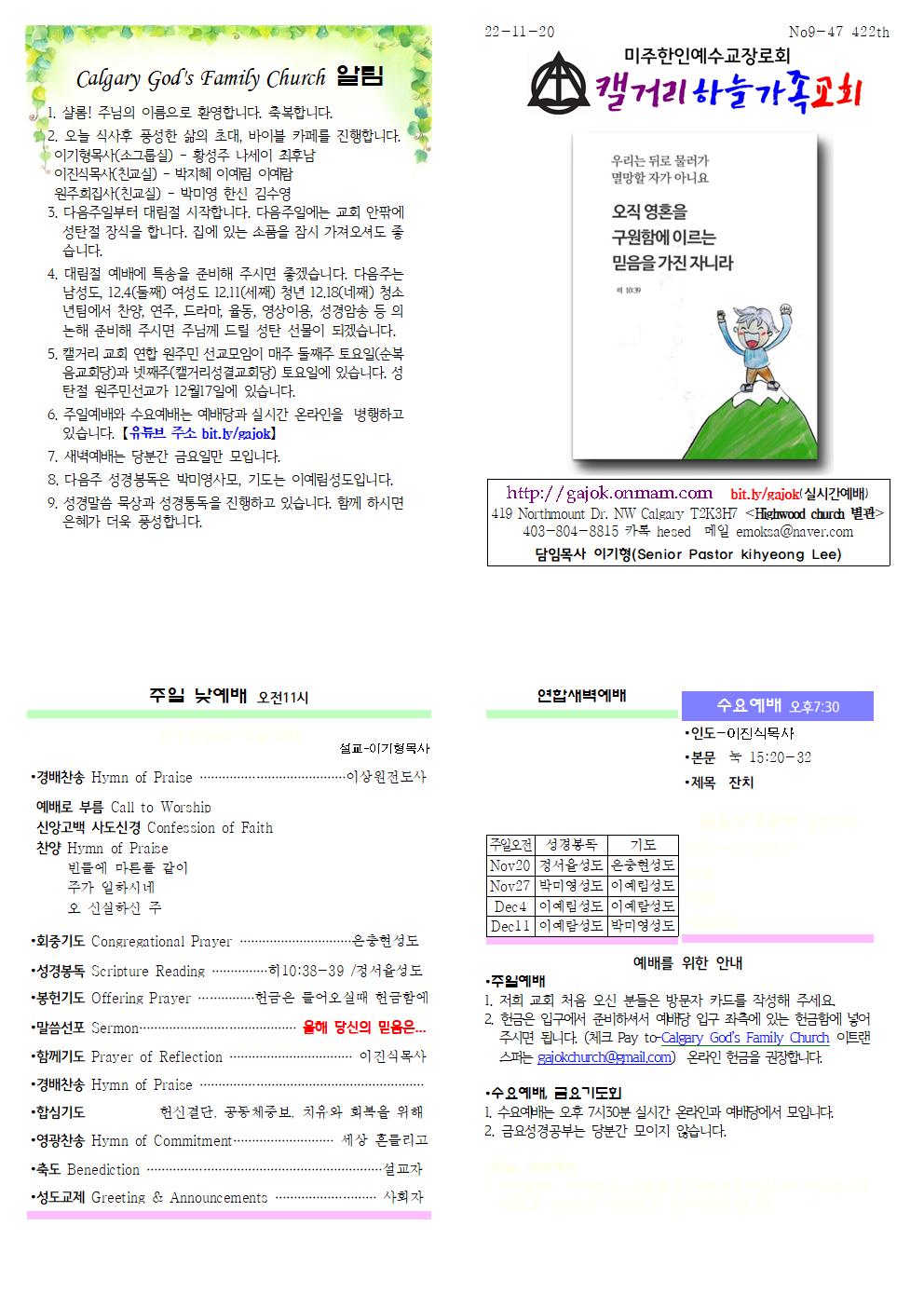 Calgary God's Family Church 알림 1. 샬롬! 주님의 이름으로 환영합니다. 축복합니다. 2. 오늘 식사후 풍성한 삶의 초대, 바이블 카페를 진행합니다. 이기형목사(소그룹실) - 황성주 나세이 최후남 이진식목사(친교실) - 박지혜 이예림 이예람 원주희집사(친교실) - 박미영 한신 김수영 3. 다음주일부터 대림절 시작합니다. 다음주일에는 교회 안팎에 성탄절 장식을 합니다. 집에 있는 소품을 잠시 가져오셔도 좋습니다. 4. 대림절 예배에 특송을 준비해 주시면 좋겠습니다. 다음주는 남성도, 12.4(둘째) 여성도 12.11(세째) 청년 12.18(네째) 청소년팀에서 찬양, 연주, 드라마, 율동, 영상이용, 성경암송 등 의논해 준비해 주시면 주님께 드릴 성탄 선물이 되겠습니다. 5. 캘거리 교회 연합 원주민 선교모임이 매주 둘째주 토요일(순복음교회당)과 넷째주(캘거리성결교회당) 토요일에 있습니다. 성탄절 원주민선교가 12월17일에 있습니다. 6. 주일예배와 수요예배는 예배당과 실시간 온라인을 병행하고 있습니다. 【유튜브 주소 bit.ly/gajok】 7. 새벽예배는 당분간 금요일만 모입니다. 8. 다음주 성경봉독은 박미영사모, 기도는 이예림성도입니다. 9. 성경말씀 묵상과 성경통독을 진행하고 있습니다. 함께 하시면 은혜가 더욱 풍성합니다.