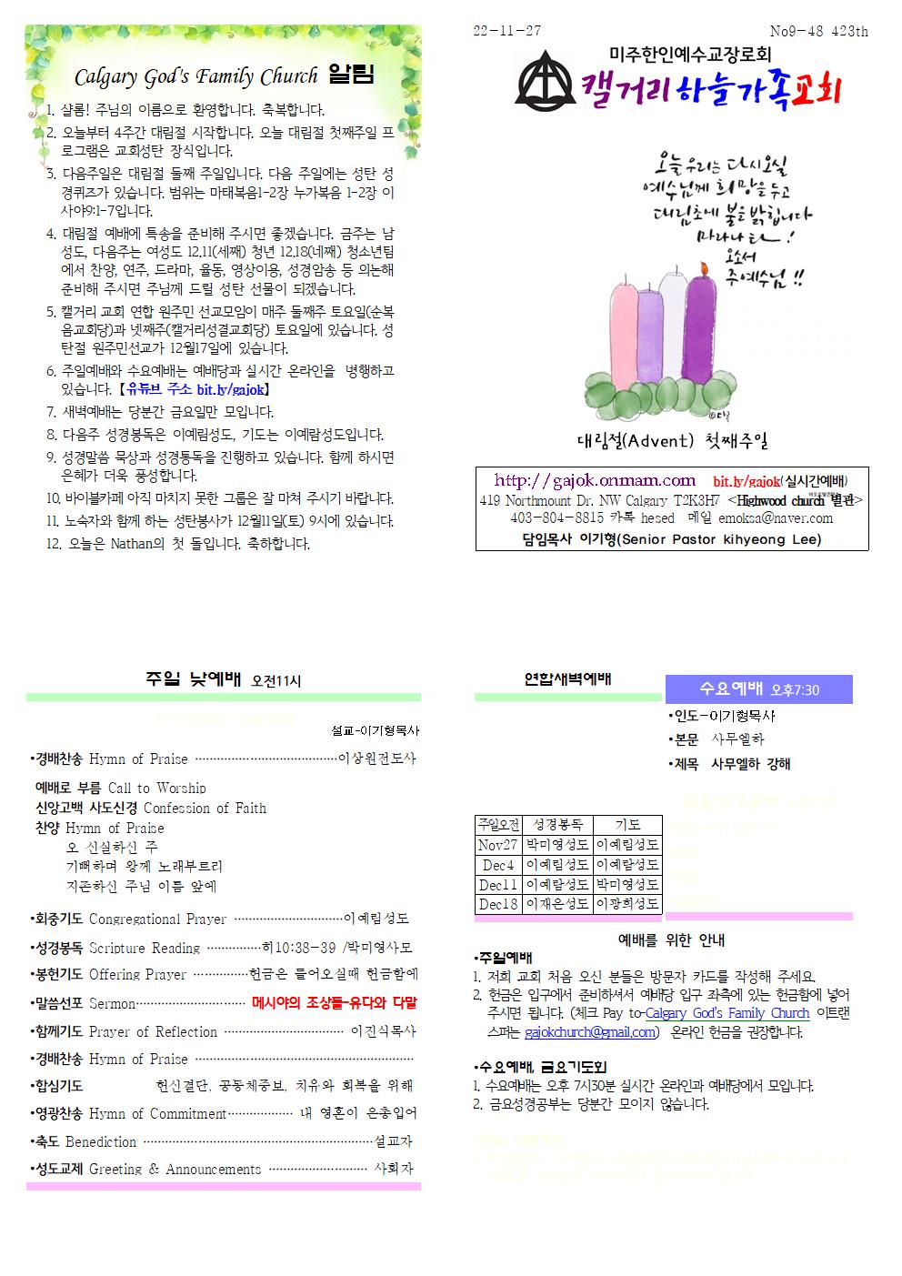Calgary God's Family Church 알림 1. 샬롬! 주님의 이름으로 환영합니다. 축복합니다. 2. 오늘부터 4주간 대림절 시작합니다. 오늘 대림절 첫째주일 프로그램은 교회성탄 장식입니다. 3. 다음주일은 대림절 둘째 주일입니다. 다음 주일에는 성탄 성경퀴즈가 있습니다. 범위는 마태복음1-2장 누가복음 1-2장 이사야9:1-7입니다. 4. 대림절 예배에 특송을 준비해 주시면 좋겠습니다. 금주는 남성도, 다음주는 여성도 12.11(세째) 청년 12.18(네째) 청소년팀에서 찬양, 연주, 드라마, 율동, 영상이용, 성경암송 등 의논해 준비해 주시면 주님께 드릴 성탄 선물이 되겠습니다. 5. 캘거리 교회 연합 원주민 선교모임이 매주 둘째주 토요일(순복음교회당)과 넷째주(캘거리성결교회당) 토요일에 있습니다. 성탄절 원주민선교가 12월17일에 있습니다. 6. 주일예배와 수요예배는 예배당과 실시간 온라인을 병행하고 있습니다. 【유튜브 주소 bit.ly/gajok】 7. 새벽예배는 당분간 금요일만 모입니다. 8. 다음주 성경봉독은 이예림성도, 기도는 이예람성도입니다. 9. 성경말씀 묵상과 성경통독을 진행하고 있습니다. 함께 하시면 은혜가 더욱 풍성합니다. 10. 바이블카페 아직 마치지 못한 그룹은 잘 마쳐 주시기 바랍니다. 11. 노숙자와 함께 하는 성탄봉사가 12월11일(토) 9시에 있습니다. 12. 오늘은 Nathan의 첫 돌입니다. 축하합니다.