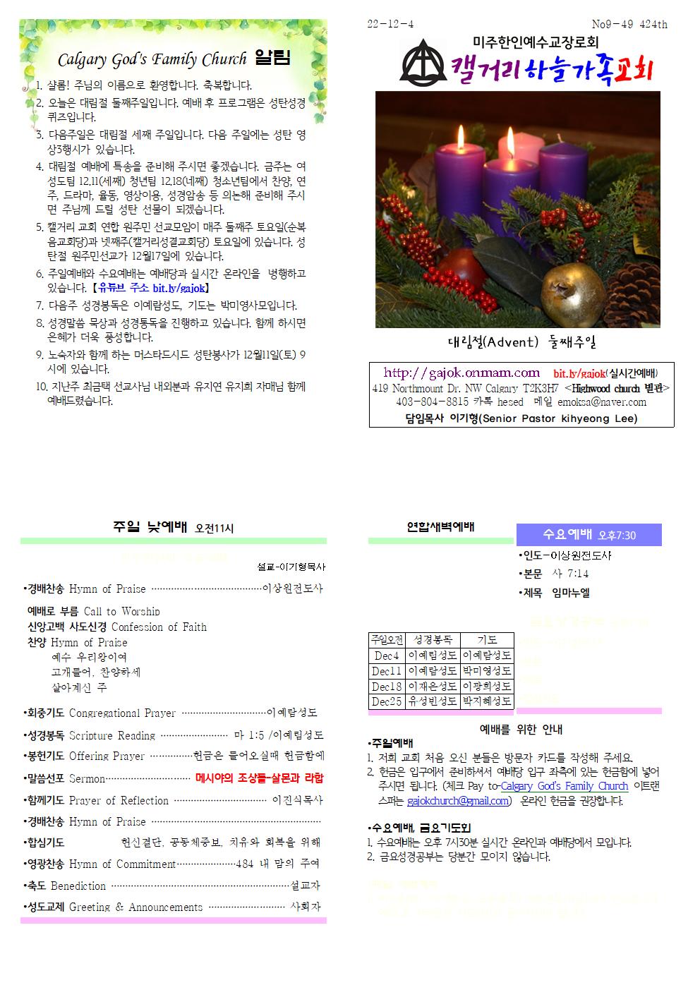 Calgary God's Family Church 알림 1. 샬롬! 주님의 이름으로 환영합니다. 축복합니다. 2. 오늘은 대림절 둘째주일입니다. 예배 후 프로그램은 성탄성경퀴즈입니다. 3. 다음주일은 대림절 세째 주일입니다. 다음 주일에는 성탄 영상3행시가 있습니다. 4. 대림절 예배에 특송을 준비해 주시면 좋겠습니다. 금주는 여성도팀 12.11(세째) 청년팀 12.18(네째) 청소년팀에서 찬양, 연주, 드라마, 율동, 영상이용, 성경암송 등 의논해 준비해 주시면 주님께 드릴 성탄 선물이 되겠습니다. 5. 캘거리 교회 연합 원주민 선교모임이 매주 둘째주 토요일(순복음교회당)과 넷째주(캘거리성결교회당) 토요일에 있습니다. 성탄절 원주민선교가 12월17일에 있습니다. 6. 주일예배와 수요예배는 예배당과 실시간 온라인을 병행하고 있습니다. 【유튜브 주소 bit.ly/gajok】 7. 다음주 성경봉독은 이예람성도, 기도는 박미영사모입니다. 8. 성경말씀 묵상과 성경통독을 진행하고 있습니다. 함께 하시면 은혜가 더욱 풍성합니다. 9. 노숙자와 함께 하는 머스타드시드 성탄봉사가 12월11일(토) 9시에 있습니다. 10. 지난주 최금택 선교사님 내외분과 유지연 유지희 자매님 함께 예배드렸습니다.