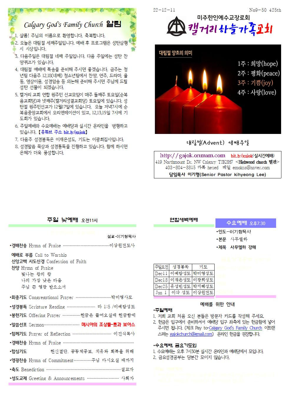 Calgary God's Family Church 알림 1. 샬롬! 주님의 이름으로 환영합니다. 축복합니다. 2. 오늘은 대림절 세째주일입니다. 예배 후 프로그램은 성탄삼행시 시상입니다. 3. 다음주일은 대림절 네째 주일입니다. 다음 주일에는 성탄 찬양퀴즈가 있습니다. 4. 대림절 예배에 특송을 준비해 주시면 좋겠습니다. 금주는 청년팀 다음주 12.18(네째) 청소년팀에서 찬양, 연주, 드라마, 율동, 영상이용, 성경암송 등 의논해 준비해 주시면 주님께 드릴 성탄 선물이 되겠습니다. 5. 캘거리 교회 연합 원주민 선교모임이 매주 둘째주 토요일(순복음교회당)과 넷째주(캘거리성결교회당) 토요일에 있습니다. 성탄절 원주민선교가 12월17일에 있습니다. 오늘 저녁7시에 순복음중앙교회에서 오리엔테이션이 있고, 12,13,15일 7시에 기도회가 있습니다. 6. 주일예배와 수요예배는 예배당과 실시간 온라인을 병행하고 있습니다. 【유튜브 주소 bit.ly/gajok】 7. 다음주 성경봉독은 이재은성도, 기도는 이광희집사입니다. 8. 성경말씀 묵상과 성경통독을 진행하고 있습니다. 함께 하시면 은혜가 더욱 풍성합니다.