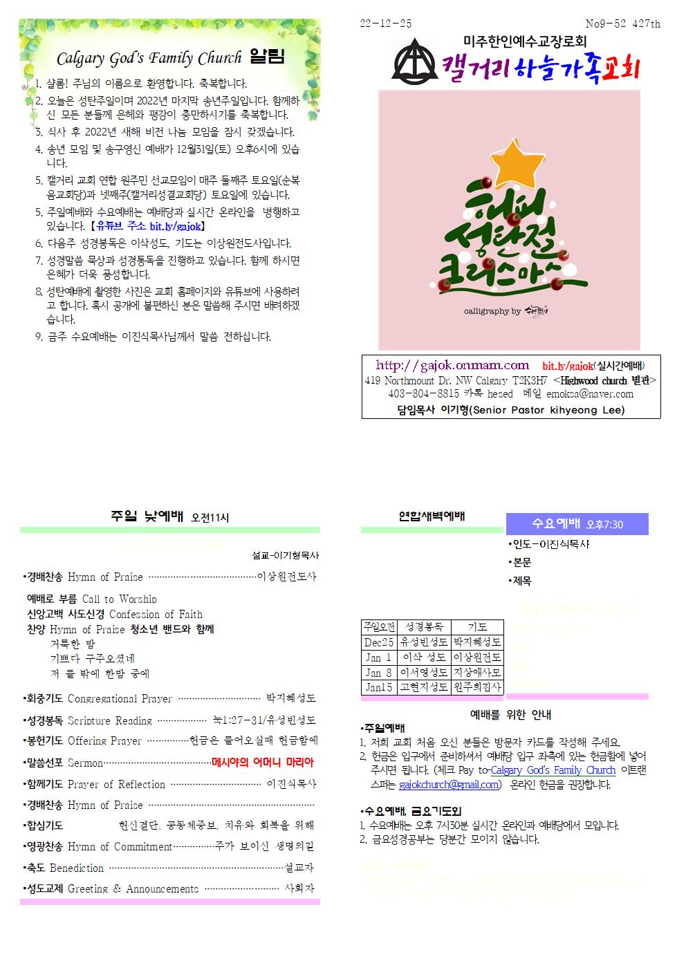 Calgary God's Family Church 알림 1. 샬롬! 주님의 이름으로 환영합니다. 축복합니다. 2. 오늘은 성탄주일이며 2022년 마지막 송년주일입니다. 함께하신 모든 분들께 은헤와 평강이 충만하시기를 축복합니다. 3. 식사 후 2022년 새해 비전 나눔 모임을 잠시 갖겠습니다. 4. 송년 모임 및 송구영신 예배가 12월31일(토) 오후6시에 있습니다. 5. 캘거리 교회 연합 원주민 선교모임이 매주 둘째주 토요일(순복음교회당)과 넷째주(캘거리성결교회당) 토요일에 있습니다. 5. 주일예배와 수요예배는 예배당과 실시간 온라인을 병행하고 있습니다. 【유튜브 주소 bit.ly/gajok】 6. 다음주 성경봉독은 이삭성도, 기도는 이상원전도사입니다. 7. 성경말씀 묵상과 성경통독을 진행하고 있습니다. 함께 하시면 은혜가 더욱 풍성합니다. 8. 성탄예배에 촬영한 사진은 교회 홈페이지와 유튜브에 사용하려고 합니다. 혹시 공개에 불편하신 분은 말씀해 주시면 배려하겠습니다. 9. 금주 수요예배는 이진식목사님께서 말씀 전하십니다.