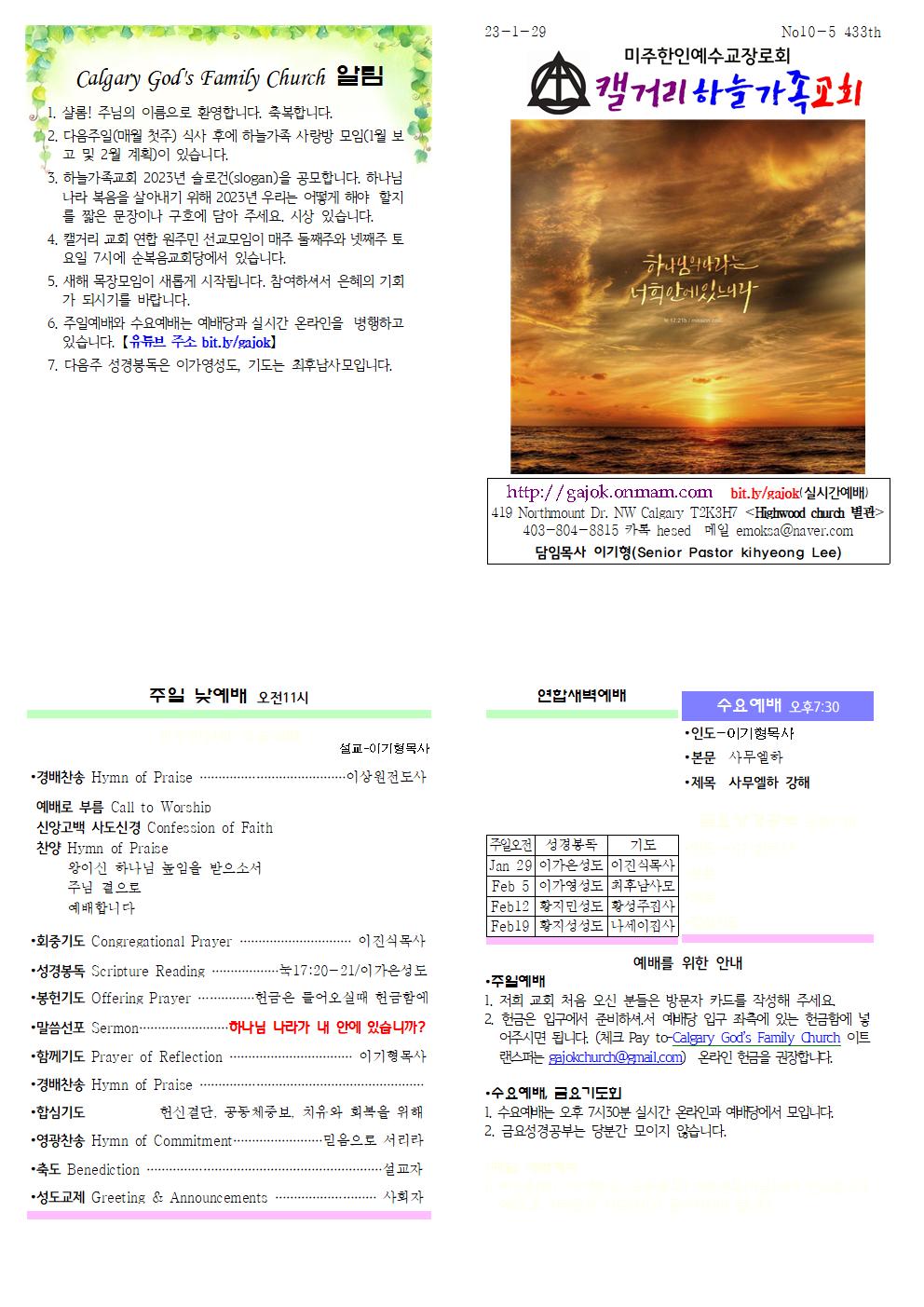Calgary God's Family Church 알림 1. 샬롬! 주님의 이름으로 환영합니다. 축복합니다. 2. 다음주일(매월 첫주) 식사 후에 하늘가족 사랑방 모임(1월 보고 및 2월 계획)이 있습니다. 3. 하늘가족교회 2023년 슬로건(slogan)을 공모합니다. 하나님 나라 복음을 살아내기 위해 2023년 우리는 어떻게 해야 할지를 짧은 문장이나 구호에 담아 주세요. 시상 있습니다. 4. 캘거리 교회 연합 원주민 선교모임이 매주 둘째주와 넷째주 토요일 7시에 순복음교회당에서 있습니다. 5. 새해 목장모임이 새롭게 시작됩니다. 참여하셔서 은혜의 기회가 되시기를 바랍니다. 6. 주일예배와 수요예배는 예배당과 실시간 온라인을 병행하고 있습니다. 【유튜브 주소 bit.ly/gajok】 7. 다음주 성경봉독은 이가영성도, 기도는 최후남사모입니다.