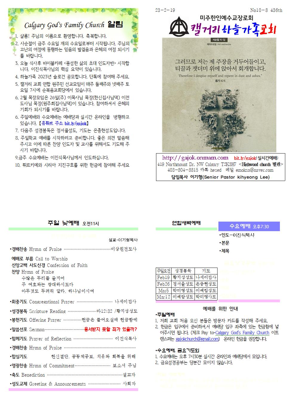 Calgary God's Family Church 알림 1. 샬롬! 주님의 이름으로 환영합니다. 축복합니다. 2. 사순절이 금주 수요일 재의 수요일로부터 시작됩니다. 주님의 고난의 여정에 동행하는 믿음의 발걸음과 은혜의 여정 되시기를 바랍니다. 3. 오늘 식사후 바이블카페 <풍성한 삶의 초대 인도자반> 시작합니다. 이진식목사님의 핵심 요약이 있습니다. 4. 하늘가족 2023년 슬로건 공모합니다. 단톡에 참여해 주세요. 5. 캘거리 교회 연합 원주민 선교모임이 매주 둘째주와 넷째주 토요일 7시에 순복음교회당에서 있습니다. 6. 2월 목장모임은 26일(주) 이목사님 목장(한신집사님댁) 이전도사님 목장(원주희집사님댁)이 있습니다. 참여하셔서 은혜의 기회가 되시기를 바랍니다. 6. 주일예배와 수요예배는 예배당과 실시간 온라인을 병행하고 있습니다. 【유튜브 주소 bit.ly/gajok】 7. 다음주 성경봉독은 정서율성도, 기도는 은충현성도입니다. 8. 주일학교 예배를 시작하려고 준비합니다. 좋은 의견 말씀해 주시고 이에 따른 찬양 인도자 및 교사를 위해서도 기도해 주시기 바랍니다. 9.금주 수요예배는 이진식목사님께서 인도하십니다. 10. 튀르키예와 시리아 지진구호를 위한 헌금에 참여해 주세요.