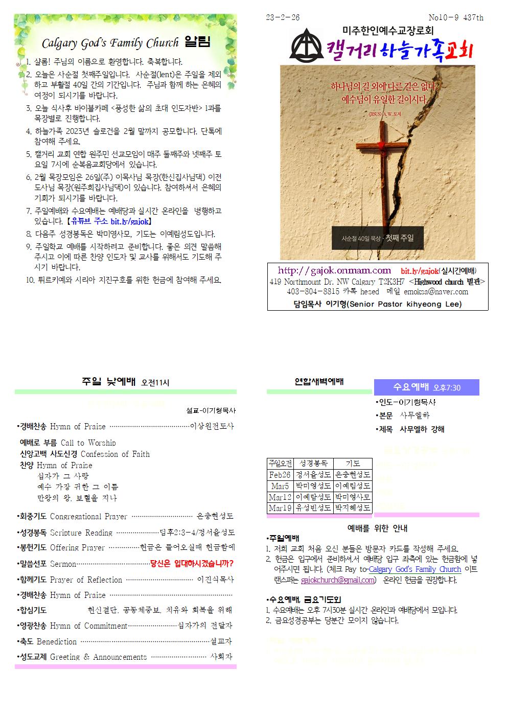 Calgary God's Family Church 알림 1. 샬롬! 주님의 이름으로 환영합니다. 축복합니다. 2. 오늘은 사순절 첫째주일입니다. 사순절(lent)은 주일을 제외하고 부활절 40일 간의 기간입니다. 주님과 함께 하는 은혜의 여정이 되시기를 바랍니다. 3. 오늘 식사후 바이블카페 <풍성한 삶의 초대 인도자반> 1과를 목장별로 진행합니다. 4. 하늘가족 2023년 슬로건을 2월 말까지 공모합니다. 단톡에 참여해 주세요. 5. 캘거리 교회 연합 원주민 선교모임이 매주 둘째주와 넷째주 토요일 7시에 순복음교회당에서 있습니다. 6. 2월 목장모임은 26일(주) 이목사님 목장(한신집사님댁) 이전도사님 목장(원주희집사님댁)이 있습니다. 참여하셔서 은혜의 기회가 되시기를 바랍니다. 7. 주일예배와 수요예배는 예배당과 실시간 온라인을 병행하고 있습니다. 【유튜브 주소 bit.ly/gajok】 8. 다음주 성경봉독은 박미영사모, 기도는 이예림성도입니다. 9. 주일학교 예배를 시작하려고 준비합니다. 좋은 의견 말씀해 주시고 이에 따른 찬양 인도자 및 교사를 위해서도 기도해 주시기 바랍니다. 10. 튀르키예와 시리아 지진구호를 위한 헌금에 참여해 주세요.