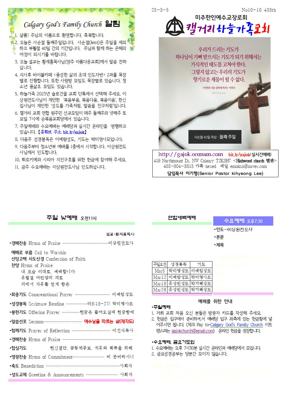 Calgary God's Family Church 알림 1. 샬롬! 주님의 이름으로 환영합니다. 축복합니다. 2. 오늘은 사순절 둘째주일입니다. 사순절(lent)은 주일을 제외하고 부활절 40일 간의 기간입니다. 주님과 함께 하는 은혜의 여정이 되시기를 바랍니다. 3. 오늘 설교는 황재홍목사님(양주 아름다운교회)께서 말씀 전하십니다. 4. 식사후 바이블카페 <풍성한 삶의 초대 인도자반> 2과를 목장별로 진행합니다. 또한 사랑방 모임도 목장별로 있습니다. 청소년 풍삶초 모임도 있습니다. 5. 하늘가족 2023년 슬로건을 교회 단톡에서 선택해 주세요. 이상원전도사님이 제안한 '복음부음, 복음다움, 복음이음', 한신집사님이 제안한 ‘성도를 가족처럼, 말씀을 친구처럼’입니다. 6. 캘거리 교회 연합 원주민 선교모임이 매주 둘째주와 넷째주 토요일 7시에 순복음교회당에서 있습니다. 7. 주일예배와 수요예배는 예배당과 실시간 온라인을 병행하고 있습니다. 【유튜브 주소 bit.ly/gajok】 8. 다음주 성경봉독은 이예람성도, 기도는 박미영사모입니다. 9. 다음주부터 청소년부 예배를 1층에서 시작합니다. 이상원전도사님께서 인도합니다. 10. 튀르키예와 시리아 지진구호를 위한 헌금에 참여해 주세요. 11. 금주 수요예배는 이상원전도사님 인도하십니다.