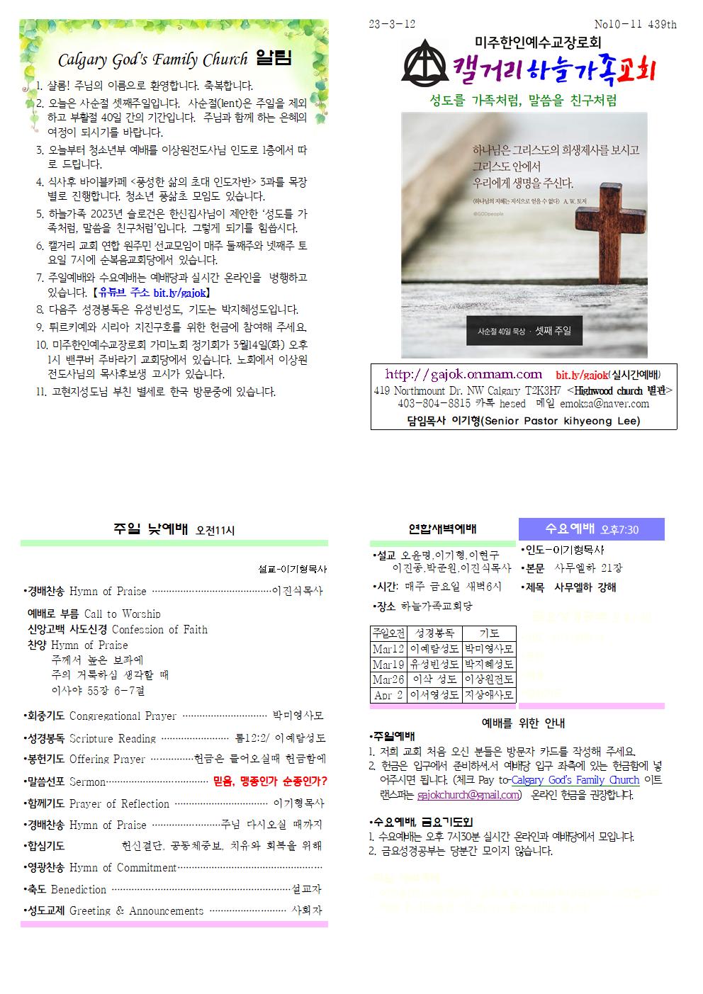 Calgary God's Family Church 알림 1. 샬롬! 주님의 이름으로 환영합니다. 축복합니다. 2. 오늘은 사순절 셋째주일입니다. 사순절(lent)은 주일을 제외하고 부활절 40일 간의 기간입니다. 주님과 함께 하는 은혜의 여정이 되시기를 바랍니다. 3. 오늘부터 청소년부 예배를 이상원전도사님 인도로 1층에서 따로 드립니다. 4. 식사후 바이블카페 <풍성한 삶의 초대 인도자반> 3과를 목장별로 진행합니다. 청소년 풍삶초 모임도 있습니다. 5. 하늘가족 2023년 슬로건은 한신집사님이 제안한 ‘성도를 가족처럼, 말씀을 친구처럼’입니다. 그렇게 되기를 힘씁시다. 6. 캘거리 교회 연합 원주민 선교모임이 매주 둘째주와 넷째주 토요일 7시에 순복음교회당에서 있습니다. 7. 주일예배와 수요예배는 예배당과 실시간 온라인을 병행하고 있습니다. 【유튜브 주소 bit.ly/gajok】 8. 다음주 성경봉독은 유성빈성도, 기도는 박지혜성도입니다. 9. 튀르키예와 시리아 지진구호를 위한 헌금에 참여해 주세요. 10. 미주한인예수교장로회 가미노회 정기회가 3월14일(화) 오후1시 밴쿠버 주바라기 교회당에서 있습니다. 노회에서 이상원전도사님의 목사후보생 고시가 있습니다. 11. 고현지성도님 부친 별세로 한국 방문중에 있습니다.