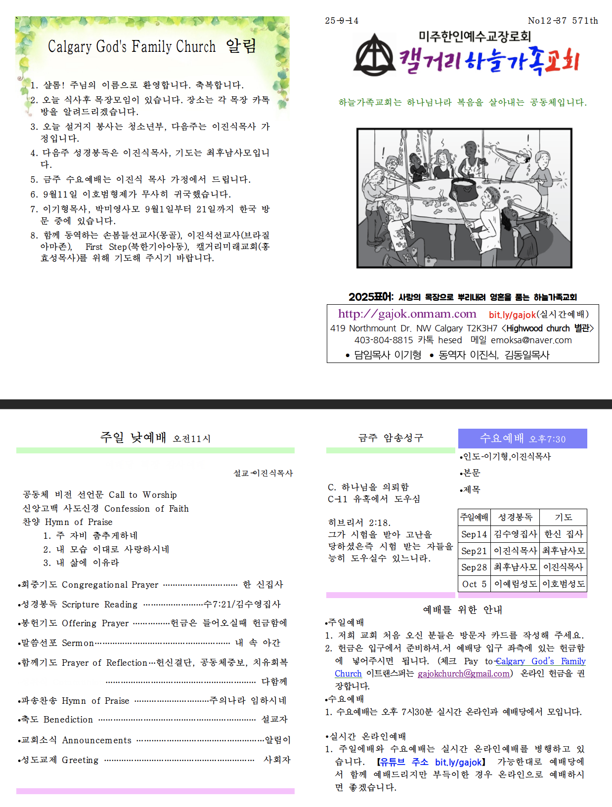 Calgary God's Family Church 알림 1. 샬롬! 주님의 이름으로 환영합니다. 축복합니다. 2. 오늘 식사후 목장모임이 있습니다. 장소는 각 목장 카톡방을 알려드리겠습니다. 3. 오늘 설거지 봉사는 청소년부, 다음주는 이진식목사 가정입니다. 4. 다음주 성경봉독은 이진식목사, 기도는 최후남사모입니다. 5. 금주 수요예배는 이진식 목사 가정에서 드립니다. 6. 9월11일 이호범형제가 무사히 귀국했습니다. 7. 이기형목사, 박미영사모 9월1일부터 21일까지 한국 방문 중에 있습니다. 8. 함께 동역하는 손봄들선교사(몽골), 이진석선교사(브라질 아마존), First Step(북한기아아동), 캘거리미래교회(홍효성목사)를 위해 기도해 주시기 바랍니다.