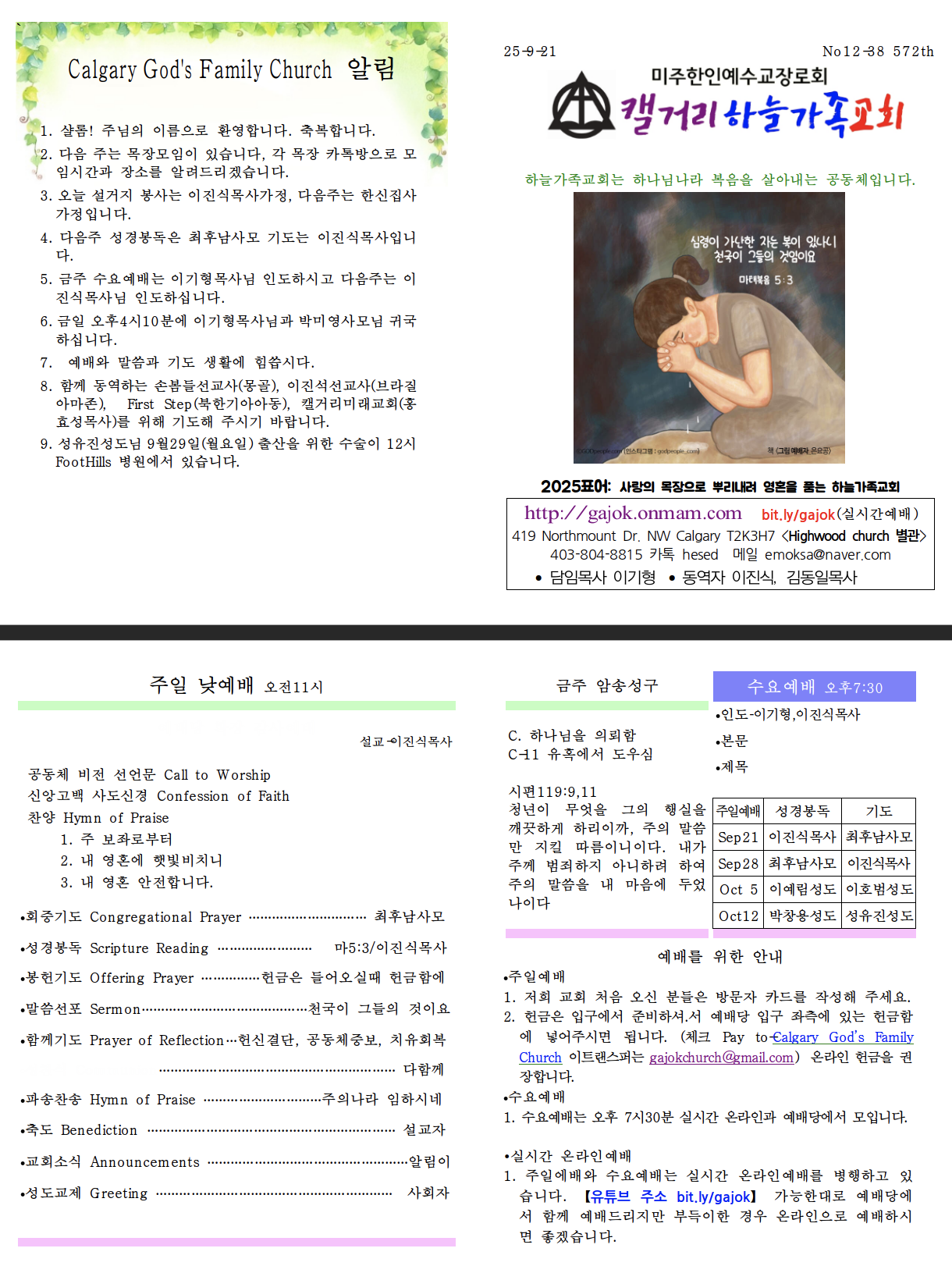 1. 샬롬! 주님의 이름으로 환영합니다. 축복합니다. 2. 다음 주는 목장모임이 있습니다, 각 목장 카톡방으로 모임시간과 장소를 알려드리겠습니다. 3. 오늘 설거지 봉사는 이진식목사가정, 다음주는 한신집사 가정입니다. 4. 다음주 성경봉독은 최후남사모 기도는 이진식목사입니다. 5. 금주 수요예배는 이기형목사님 인도하시고 다음주는 이진식목사님 인도하십니다. 6. 금일 오후4시10분에 이기형목사님과 박미영사모님 귀국하십니다. 7. 예배와 말씀과 기도 생활에 힘씁시다. 8. 함께 동역하는 손봄들선교사(몽골), 이진석선교사(브라질 아마존), First Step(북한기아아동), 캘거리미래교회(홍효성목사)를 위해 기도해 주시기 바랍니다. 9. 성유진성도님 9월29일(월요일) 출산을 위한 수술이 12시 FootHills 병원에서 있습니다.