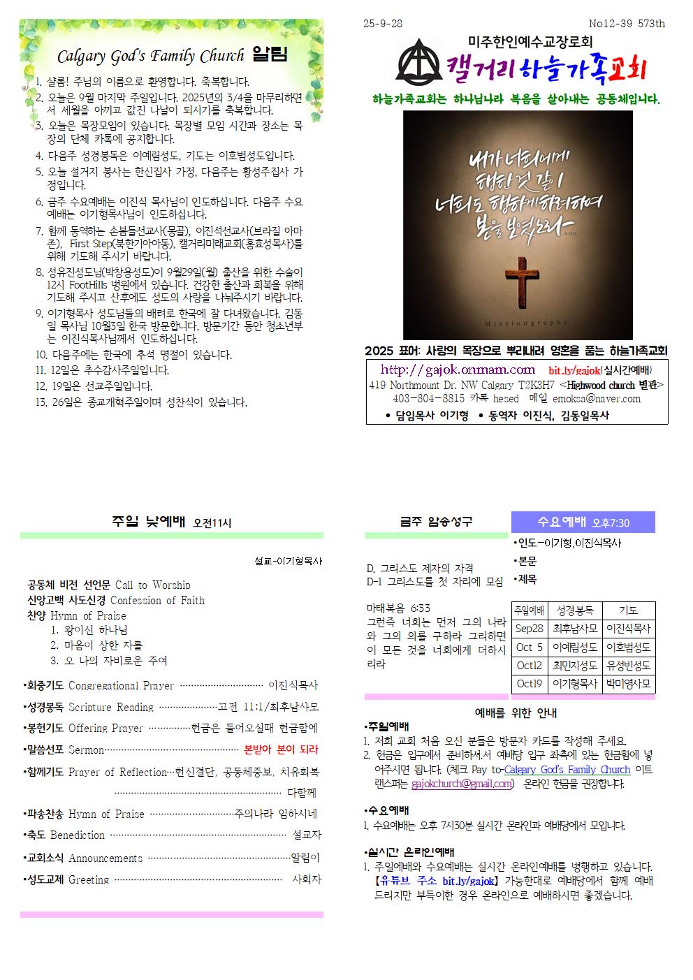 Calgary God's Family Church 알림 1. 샬롬! 주님의 이름으로 환영합니다. 축복합니다. 2. 오늘은 9월 마지막 주일입니다. 2025년의 3/4을 마무리하면서 세월을 아끼고 값진 나날이 되시기를 축복합니다. 3. 오늘은 목장모임이 있습니다. 목장별 모임 시간과 장소는 목장의 단체 카톡에 공지합니다. 4. 다음주 성경봉독은 이예림성도, 기도는 이호범성도입니다. 5. 오늘 설거지 봉사는 한신집사 가정, 다음주는 황성주집사 가정입니다. 6. 금주 수요예배는 이진식 목사님이 인도하십니다. 다음주 수요예배는 이기형목사님이 인도하십니다. 7. 함께 동역하는 손봄들선교사(몽골), 이진석선교사(브라질 아마존), First Step(북한기아아동), 캘거리미래교회(홍효성목사)를 위해 기도해 주시기 바랍니다. 8. 성유진성도님(박창용성도)이 9월29일(월) 출산을 위한 수술이 12시 FootHills 병원에서 있습니다. 건강한 출산과 회복을 위해 기도해 주시고 산후에도 성도의 사랑을 나눠주시기 바랍니다. 9. 이기형목사 성도님들의 배려로 한국에 잘 다녀왔습니다. 김동일 목사님 10월3일 한국 방문합니다. 방문기간 동안 청소년부는 이진식목사님께서 인도하십니다. 10. 다음주에는 한국에 추석 명절이 있습니다. 11. 12일은 추수감사주일입니다. 12. 19일은 선교주일입니다. 13. 26일은 종교개혁주일이며 성찬식이 있습니다.