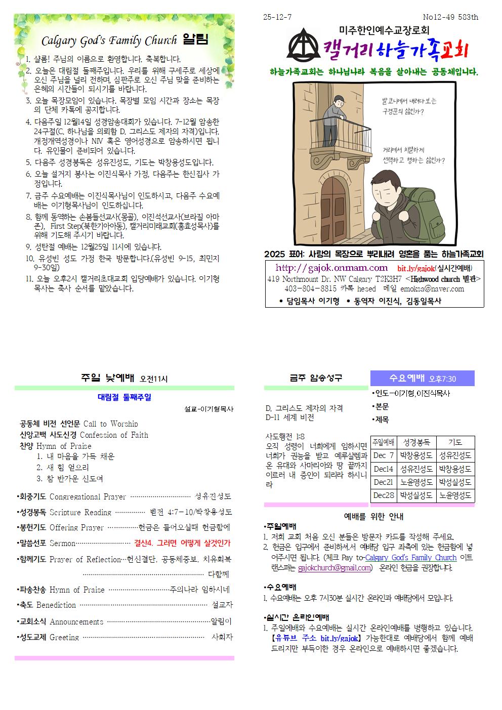 Calgary God's Family Church 알림 1. 샬롬! 주님의 이름으로 환영합니다. 축복합니다. 2. 오늘은 대림절 둘째주입니다. 우리를 위해 구세주로 세상에 오신 주님을 널리 전하며, 심판주로 오신 주님 맞을 준비하는 은혜의 시간들이 되시기를 바랍니다. 3. 오늘 목장모임이 있습니다. 목장별 모임 시간과 장소는 목장의 단체 카톡에 공지합니다. 4. 다음주일 12월14일 성경암송대회가 있습니다. 7-12월 암송한 24구절(C. 하나님을 의뢰함 D. 그리스도 제자의 자격)입니다. 개정개역성경이나 NIV 혹은 영어성경으로 암송하시면 됩니다. 유인물이 준비되어 있습니다. 5. 다음주 성경봉독은 성유진성도, 기도는 박창용성도입니다. 6. 오늘 설거지 봉사는 이진식목사 가정, 다음주는 한신집사 가정입니다. 7. 금주 수요예배는 이진식목사님이 인도하시고, 다음주 수요예배는 이기형목사님이 인도하십니다. 8. 함께 동역하는 손봄들선교사(몽골), 이진석선교사(브라질 아마존), First Step(북한기아아동), 캘거리미래교회(홍효성목사)를 위해 기도해 주시기 바랍니다. 9. 성탄절 예배는 12월25일 11시에 있습니다. 10. 유성빈 성도 가정 한국 방문합니다.(유성빈 9-15, 최민지 9-30일) 11. 오늘 오후2시 캘거리초대교회 입당예배가 있습니다. 이기형목사는 축사 순서를 맡았습니다.