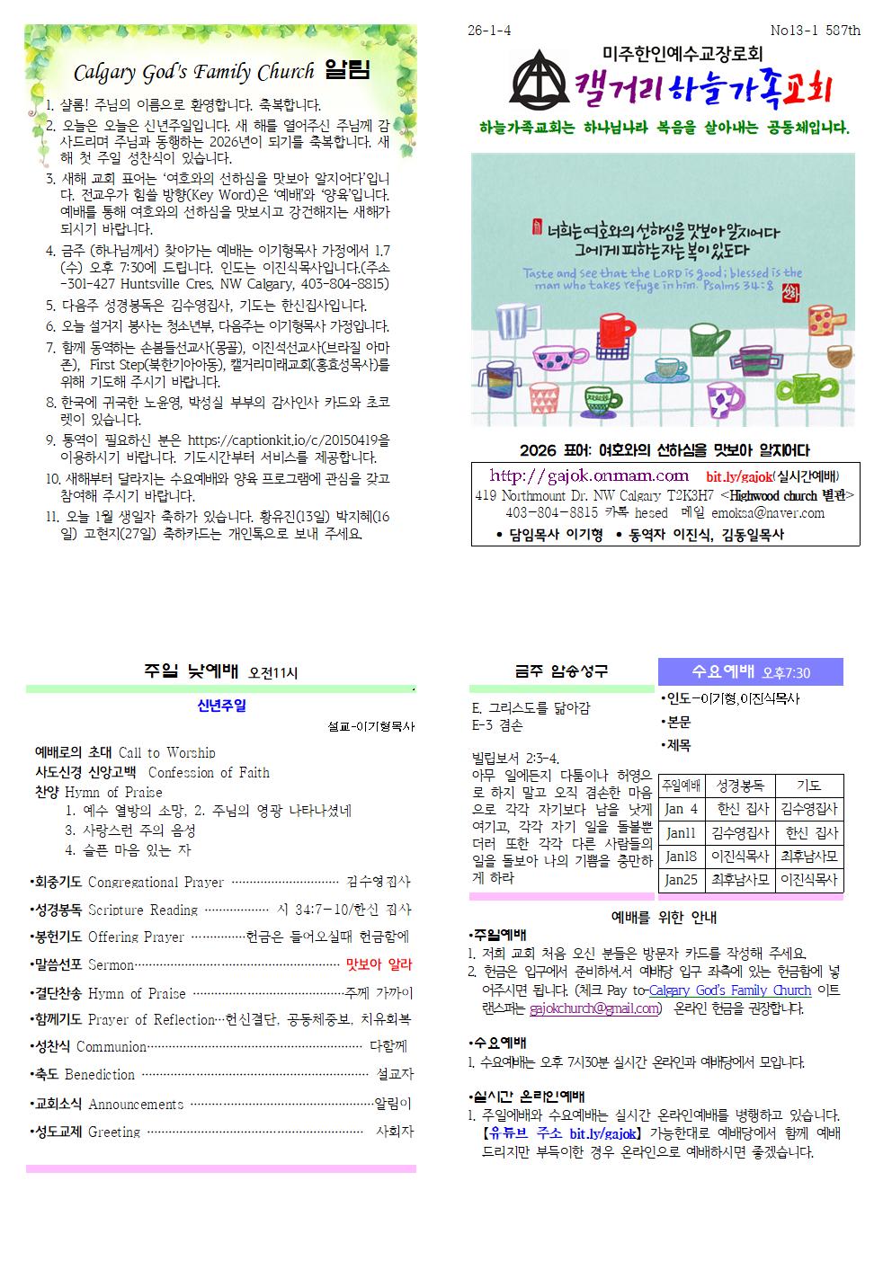 Calgary God's Family Church 알림 1. 샬롬! 주님의 이름으로 환영합니다. 축복합니다. 2. 오늘은 오늘은 신년주일입니다. 새 해를 열어주신 주님께 감사드리며 주님과 동행하는 2026년이 되기를 축복합니다. 새해 첫 주일 성찬식이 있습니다. 3. 새해 교회 표어는 ‘여호와의 선하심을 맛보아 알지어다’입니다. 전교우가 힘쓸 방향(Key Word)은 ‘예배’와 ‘양육’입니다. 예배를 통해 여호와의 선하심을 맛보시고 강건해지는 새해가 되시기 바랍니다. 4. 금주 (하나님께서) 찾아가는 예배는 이기형목사 가정에서 1.7(수) 오후 7:30에 드립니다. 인도는 이진식목사입니다.(주소-301-427 Huntsville Cres. NW Calgary, 403-804-8815) 5. 다음주 성경봉독은 김수영집사, 기도는 한신집사입니다. 6. 오늘 설거지 봉사는 청소년부, 다음주는 이기형목사 가정입니다. 7. 함께 동역하는 손봄들선교사(몽골), 이진석선교사(브라질 아마존), First Step(북한기아아동), 캘거리미래교회(홍효성목사)를 위해 기도해 주시기 바랍니다. 8. 한국에 귀국한 노윤영, 박성실 부부의 감사인사 카드와 초코렛이 있습니다. 9. 통역이 필요하신 분은 https://captionkit.io/c/20150419을 이용하시기 바랍니다. 기도시간부터 서비스를 제공합니다. 10. 새해부터 달라지는 수요예배와 양육 프로그램에 관심을 갖고 참여해 주시기 바랍니다. 11. 오늘 1월 생일자 축하가 있습니다. 황유진(13일) 박지혜(16일) 고현지(27일) 축하카드는 개인톡으로 보내 주세요.