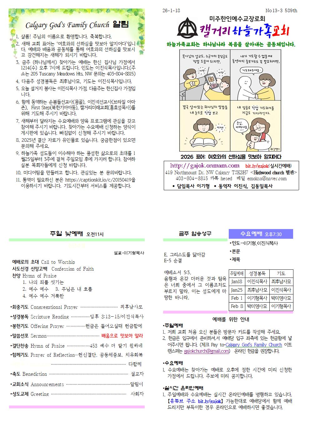 Calgary God's Family Church 알림 1. 샬롬! 주님의 이름으로 환영합니다. 축복합니다. 2. 새해 교회 표어는 ‘여호와의 선하심을 맛보아 알지어다’입니다. 예배와 배움과 공동체를 통해 여호와의 선하심을 맛보시고 강건해지는 새해가 되시기 바랍니다. 3. 금주 (하나님께서) 찾아가는 예배는 한신 집사님 가정에서 1214(수) 오후 7시에 드립니다. 인도는 이진식목사입니다.(주소는 205 Tuscany Meadows Hts. NW 문의는 403-804-8815) 4. 다음주 성경봉독은 최후남사모, 기도는 이진식목사입니다. 5. 오늘 설거지 봉사는 이진식목사 가정, 다음주는 한신집사 가정입니다. 6. 함께 동역하는 손봄들선교사(몽골), 이진석선교사(브라질 아마존), First Step(북한기아아동), 캘거리미래교회(홍효성목사)를 위해 기도해 주시기 바랍니다. 7. 새해부터 달라지는 수요예배와 양육 프로그램에 관심을 갖고 참여해 주시기 바랍니다. 찾아가는 수요예배 신청하는 양식이 게시판에 있습니다. 빠짐없이 신청해 주시기 바랍니다. 8. 2025년 결산 자료가 유인물로 있습니다. 궁금한점이 있으면 문의해 주세요. 9. 하늘가족 성도들이 이수해야 하는 풍성한 삶으로의 초대를 1월25일부터 3주에 걸쳐 주일모임 후에 가지려 합니다. 참여하실분 목회자들에게 신청 바랍니다. 10. 미디어팀을 만들려고 합니다. 관심있는 분 문의바랍니다. 11. 통역이 필요하신 분은 https://captionkit.io/c/20150419을 이용하시기 바랍니다. 기도시간부터 서비스를 제공합니다.