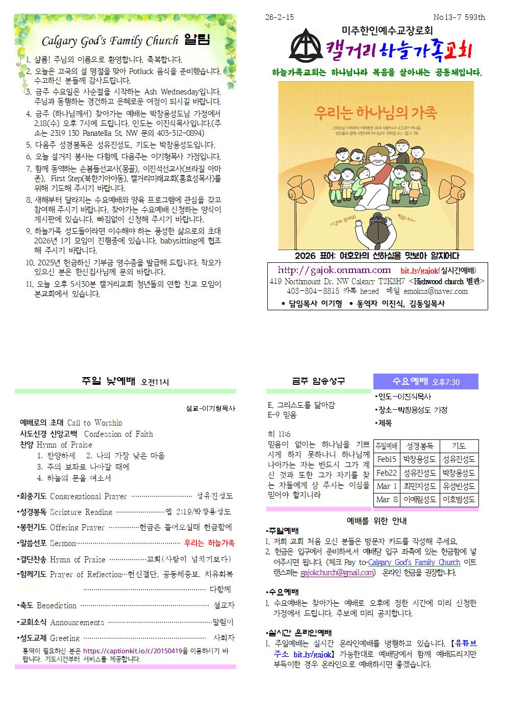Calgary God's Family Church 알림 1. 샬롬! 주님의 이름으로 환영합니다. 축복합니다. 2. 오늘은 고국의 설 명절을 맞아 Potluck 음식을 준비했습니다. 수고하신 분들께 감사드립니다. 3. 금주 수요일은 사순절을 시작하는 Ash Wednesday입니다. 주님과 동행하는 경건하고 은혜로운 여정이 되시길 바랍니다. 4. 금주 (하나님께서) 찾아가는 예배는 박창용성도님 가정에서 2.18(수) 오후 7시에 드립니다. 인도는 이진식목사입니다.(주소는 2319 130 Panatella St. NW 문의 403-312-0894) 5. 다음주 성경봉독은 성유진성도, 기도는 박창용성도입니다. 6. 오늘 설거지 봉사는 다함께, 다음주는 이기형목사 가정입니다. 7. 함께 동역하는 손봄들선교사(몽골), 이진석선교사(브라질 아마존), First Step(북한기아아동), 캘거리미래교회(홍효성목사)를 위해 기도해 주시기 바랍니다. 8. 새해부터 달라지는 수요예배와 양육 프로그램에 관심을 갖고 참여해 주시기 바랍니다. 찾아가는 수요예배 신청하는 양식이 게시판에 있습니다. 빠짐없이 신청해 주시기 바랍니다. 9. 하늘가족 성도들이라면 이수해야 하는 풍성한 삶으로의 초대 2026년 1기 모임이 진행중에 있습니다. babysitting에 협조해 주시기 바랍니다. 10. 2025년 헌금하신 기부금 영수증을 발급해 드립니다. 착오가 있으신 분은 한신집사님께 문의 바랍니다. 11. 오늘 오후 5시30분 캘거리교회 청년들의 연합 친교 모임이 본교회에서 있습니다.
