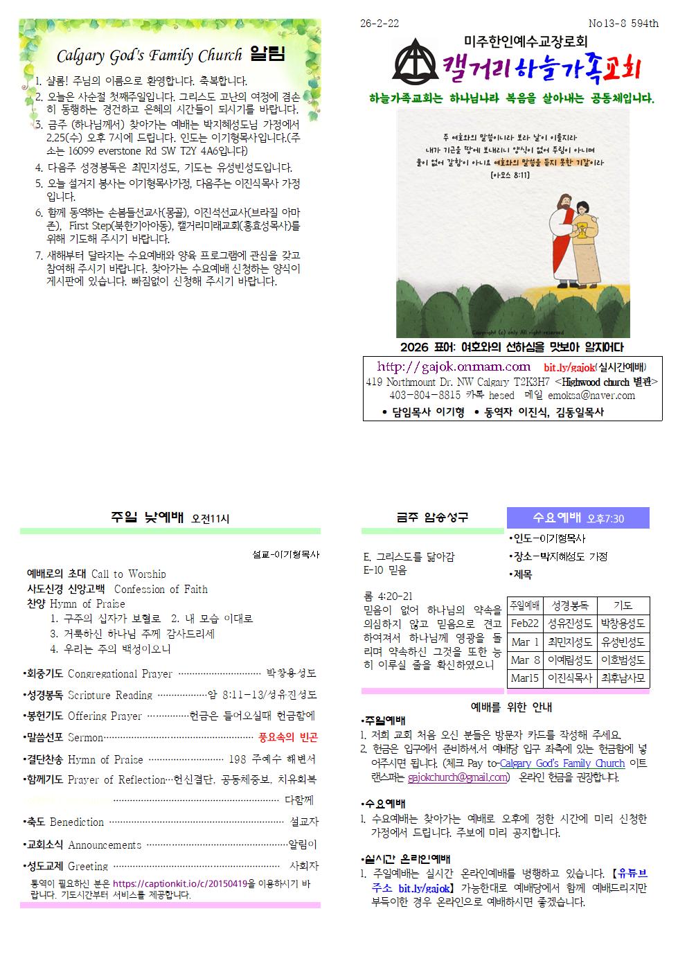 Calgary God's Family Church 알림 1. 샬롬! 주님의 이름으로 환영합니다. 축복합니다. 2. 오늘은 사순절 첫째주일입니다. 그리스도 고난의 여정에 겸손히 동행하는 경건하고 은혜의 시간들이 되시기를 바랍니다. 3. 금주 (하나님께서) 찾아가는 예배는 박지혜성도님 가정에서 2.25(수) 오후 7시에 드립니다. 인도는 이기형목사입니다.(주소는 16099 everstone Rd SW T2Y 4A6입니다) 4. 다음주 성경봉독은 최민지성도, 기도는 유성빈성도입니다. 5. 오늘 설거지 봉사는 이기형목사가정, 다음주는 이진식목사 가정입니다. 6. 함께 동역하는 손봄들선교사(몽골), 이진석선교사(브라질 아마존), First Step(북한기아아동), 캘거리미래교회(홍효성목사)를 위해 기도해 주시기 바랍니다. 7. 새해부터 달라지는 수요예배와 양육 프로그램에 관심을 갖고 참여해 주시기 바랍니다. 찾아가는 수요예배 신청하는 양식이 게시판에 있습니다. 빠짐없이 신청해 주시기 바랍니다.