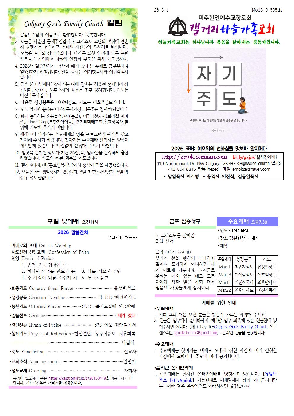 Calgary God's Family Church 알림 1. 샬롬! 주님의 이름으로 환영합니다. 축복합니다. 2. 오늘은 사순절 둘째주일입니다. 그리스도 고난의 여정에 겸손히 동행하는 경건하고 은혜의 시간들이 되시기를 바랍니다. 3. 오늘은 모국의 삼일절입니다. 나라를 되찾기 위해 피를 흘린 선조들을 기억하고 나라의 안정과 부국을 위해 기도합시다. 4. 2026년 말씀잔치가 청년아 때가 찼다는 주제로 금주부터 4월5일까지 진행됩니다. 말씀 강사는 이기형목사와 이진식목사입니다. 5. 금주 (하나님께서) 찾아가는 예배 장소는 김유현 형제님이 섬깁니다. 3.4(수) 오후 7시에 장소는 추후 공지합니다. 인도는 이진식목사입니다. 6. 다음주 성경봉독은 이예림성도, 기도는 이호범성도입니다. 7. 오늘 설거지 봉사는 이진식목사가정, 다음주는 청년부1팀입니다. 8. 함께 동역하는 손봄들선교사(몽골), 이진석선교사(브라질 아마존), First Step(북한기아아동), 캘거리미래교회(홍효성목사)를 위해 기도해 주시기 바랍니다. 9. 새해부터 달라지는 수요예배와 양육 프로그램에 관심을 갖고 참여해 주시기 바랍니다. 찾아가는 수요예배 신청하는 양식이 게시판에 있습니다. 빠짐없이 신청해 주시기 바랍니다. 10. 임상묵 문지원 성도가 지난 26일(목) 임하온을 건강하게 출산하였습니다. 산모의 빠른 회복을 기도합니다. 11. 캘거리미래교회(홍효성목사님)에서 중식에 떡을 제공했습니다. 12. 오늘은 3월 생일축하가 있습니다. 3일 최후남사모님과 15일 박창용 성도님입니다.