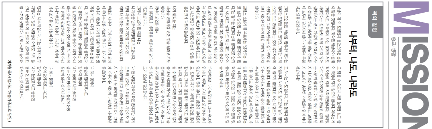 나부터, 나도, 나라도 세상이 왜 이 모양인지 불만스러운 분들이 많을 것입니다. 죄악된 세상이야 원래 그렇다치고 거룩해야 하는 교회와 서로 사랑한다는 성도들도 크게 다르지 않아 실망하시는 분도 계실지 모르겠고, 아무리 설교를 하고 성경공부를 해도 성도들이 도무지 달라지지 않아 낙담하는 목회자도 있을 것입니다. 그리스도인들은 세상을 변화시키겠다는 원대한 포부를 갖고 있구요, 그러한 그리스도인으로 만들겠다는 것이 목회자들의 소망일텐데 그리스도인들도 잘 바뀌지 않으니 세상은 더욱이 바뀔 기미가 보이지 않습니다. 프랑스 소설가 폴 부르제는 "생각하는 대로 살지 않으면, 사는 대로 생각하게 된다."는 경구를 남겼다는데 생각대로 안되니 사는대로 생각하고 되는대로 살아야 할까요? 변화의 대상과 시발점이 틀렸다고 현자들이 지적해 줍니다. 웨스터민스터 묘지에 있는 성공회 주교의 묘비에 있는 글이라고도 하고, 이슬람 지도자였던 바야지드 바스타미의 기도문이라고도 하고, 나스룻딘의 글이라도 하는데, 암튼 내용은 크게 다르지 않습니다. 내가 젊었을 때는 세상을 변화시킬 만한 힘을 달라고 기도했습니다. 중년이 되었을 때는 내 친구들과 가족들을 변화시켜 달라고 기도했습니다. 그러나 노년이 된 지금 나는 나 자신을 변화시켜달라고 기도합니다. 만약 처음부터 이 기도를 드렸다면 아마 내 인생은 훨씬 달라졌을 것입니다. 변화의 시작은 ‘너’가 아니라 ‘나’가 되어야 한다는 것을 가르쳐 줍니다. 내가 기준이니까 세상이 거기에 맞춰야 한다는 생각을 버리고 내가 그 기준에 맞추는 겁니다. 지구를 중심으로 해달별이 움직인다는 생각을 버리고 태양이 중심이라는 것을 발견했듯이 세상의 중심이 내가 아니라는 것을 발견하는 것은 코페르니쿠스적인 변혁이 필요하지만 그게 맞는거 아닙니까? 변화의 대상이 ‘나’라면 거기에 몇 가지 조사를 달리 붙여 봅니다. 먼저는 ‘나부터’입니다. 그는 개척자 선구자입니다. 많은 사람들이 아무도 하지 않으니 군중심리에 동조되어 변화의 필요를 느끼지 못합니다. 먼저 나서면 돌이라도 맞을 수 있으니 서로 눈치만 보고 굳이 타겟이 되지 않으려 합니다. 역사는 개척자들에 의해 시작되었습니다. 길이없다고 아우성이지만 길을 만들고 길이 되는 사람이 필요합니다. 할 수만 있다면 먼저 나서보십시오. 어쩌면 외롭고 고달플지 모르지만 충분히 가치있는 일이 아니겠습니까? 또 하나는 ‘나도’입니다. 그는 동역자 협력자입니다. 나서지도 않으면서 남의 장단에 춤추지 않겠다고 하는 비협조가 많이 있습니다. 남의 잘되는 꼴을 보지 못하겠다는 시기심도 은연중 들어 있습니다. 예수님의 비유 가운데 ‘이 시대 사람들이 피리를 불어도 춤추지 않고 애곡하여도 가슴을 치지 않는다’(눅 7:32)고 한탄하셨는데 아무리 좋은 일이라해도 동참하는 협력자들이 없으면 그 일은 이루어질리 없습니다. 티끌모아 태산이라는데 작은 힘을 보태 주세요. 마지막으로 ‘나라도’입니다. 그는 순교자입니다. 아무도 가지 않고 외면하는 길이 있습니다. 좁은 길이고 희생의 길이겠지요. 모두가 자기의 이익과 욕심만을 좇아 갑니다. 그래서 공동체가 약해지고 무너집니다. 아무도 가지 않겠다기에 그렇게 될 수 밖에 없다지만 한 사람이라도 용기를 내서 세대를 거스릴 수만 있다면, 그 물줄기의 흐름을 바꿀 수 있다면 역사는 그를 기억할 겁니다. 남은 자, 모두가 그렇게 하더라도 그렇게 하지 않은 최후의 보루, 그가 오늘날 필요합니다.