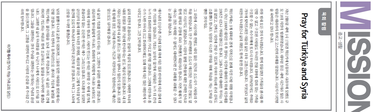 | <디스타임 목회칼럼>Pray for Türkiye and Syria | 이기형 | 2023-02-24 | |||